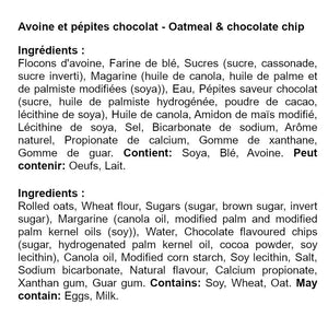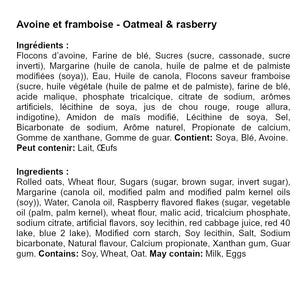 This Box contains an assortment of oatmeal raspberry and oatmeal chocolate chip cookies. Placing one of these cookies in a lunch box is a sure way to get a smile and a hug at the end of the day! Tender and delicious, these Classics are great, with a glass of milk or warm beverage. Made from whole grains, these cookies will keep your family fuelled up during those busy days!