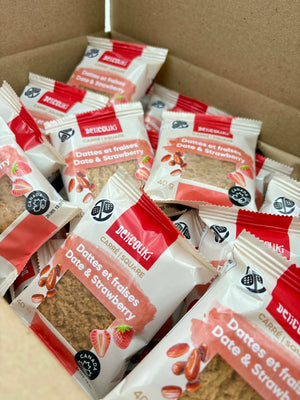 This duo box of Dates & banana squares (12 bags) and Dates & strawberry suqres (12 bags) offers you 24 individual squares of happiness!